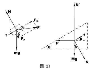 对第二个物理情景,分别隔离滑块和斜面体分析受力,并将F沿斜面、垂直斜面分解成Fx和Fy ,滑块与斜面之间的两对相互作用力只用两个字母表示(N表示正压力和弹力,f表示摩擦力),如图21所示。