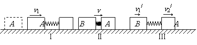 ⑴弹簧是完全弹性的。Ⅰ→Ⅱ系统动能减少全部转化为弹性势能,Ⅱ状态系统动能最小而弹性势能最大;Ⅱ→Ⅲ弹性势能减少全部转化为动能;因此Ⅰ、Ⅲ状态系统动能相等。这种碰撞叫做弹性碰撞。由动量守恒和能量守恒可以证明A、B的最终速度分别为: