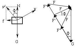 (为一定值)。这样木块可认为受到三个力:重力G,桌面对木块的作用力F'和拉力F的作用。尽管F大小方向均未确定,F'方向一定,但大小未定,但三力首尾相连后必构成三角形,如右图所示。只用当F与F'垂直时,即拉力与水平方向成