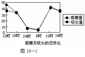 答:植物主要的吸水方式是渗透吸水,一般吸水力主要来自蒸腾作用拉力。图10-1是向日葵的蒸腾及吸水的日变化,从中可以看出,蒸腾与吸水有着大致的平行关系,吸水总是稍稍落后于蒸腾。蒸腾作用还是促使水分内运输的重要动力。