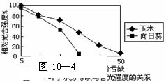 l 有人实验,把叶子从植株上切下后,立即放在保持高湿度、光照充足的容器内,叶子的含水量,由于蒸腾而徐徐减少,然后,测定叶子在发生水分亏缺情况下,相对光合作用强度。结果,叶子水分亏缺,对光合作用的影响是明显的,其关系如图10-4所示。其主要原因可能是水分亏缺造成气孔关闭,降低了二氧化碳的吸收量,从而影响了光合作用。另外,不同植物,水分亏缺对光合作用的影响程度不同。