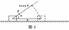 (2)如果力的方向与物体的运动方向成某一角度,该怎样计算功呢?物体m在与水平方向成α角的力F的作用下,沿水平方向向前行驶的距离为s,如图2所示,求力F对物体所做的功。