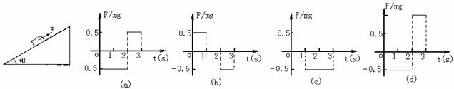 如图所示,在倾角为300的足够长的光滑斜面上有一质量为m的物体,它受到沿斜面方向的力F的作用。力F可按图(a)、(b)(c)、(d)所示的四种方式随时间变化(图中纵坐标是F与mg的比值,力沿斜面向上为正)。已知此物体在t=0时速度为零,若用v1、v2 、v3 、v4分别表示上述四种受力情况下物体在3秒末的速率,则这四个速率中最大的是( )