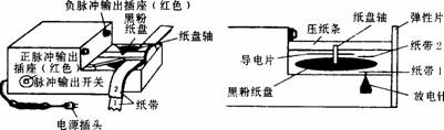 电火花计时器是利用火花放电时在纸带上打出小孔而显示出点迹的计时仪器,其结构如图所示。使用时,墨粉纸盘套在低盘轴上,并夹在两条纸带之间。当接通220V交流电源,按下脉冲输出开关时,计时器发出的脉冲电流经接正极的放电针、墨粉纸盘到接负极的纸盘轴产生火花放电。于是在运动的纸带上就打出一列点迹。当电源频率是50Hz时,它每隔O.02s打一次点。