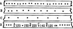 如图所示的四条纸带,是某同学练习使用打点计时器得到的纸带的右端后通过打点计时器。从点痕的分布情况可以断定:纸带_______是匀速通过打点计时器的,纸带_____是越走越快的,纸带_______是先越走越快,后来又越走越慢。
