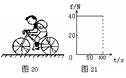 19.(7分)如图20所示,质量为40kg的小明同学骑着一辆自行车在平直公路上匀速运动100m,所用时间为20s。求:
