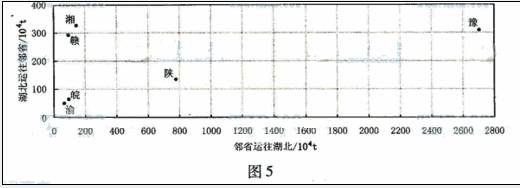 图5显示某年湖北省与相邻省级行政区往来货物的铁路运输量差异。读图5,回答第10、11题。