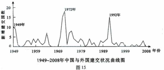 (2) 中华人民共和国成立以来 ,形成了1949年、1972年和1992年三次与外国建交的高峰(见图15)。请从中任选一次,指出促成该次建交高峰的国内外因素。(8分)