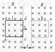 (12分)如图所示,有理想边界的两个匀强磁场,磁感应强度B=0.5T,两边界间距s=0.1m。一边长L=0.2m的正方形线框abcd由粗细均匀的电阻丝围成,总电阻R=0.4Ω。现使线框以v=2m/s的速度从位置I匀速运动到位置II。