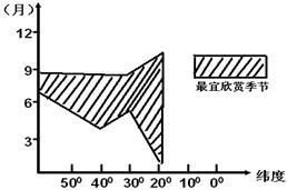 英国人汤姆想到中国旅游,但不知何时旅行最好。当地旅行社向汤姆提供了一幅“中国山水风景区最宜欣赏季节与纬度关系图”,帮助汤姆确定旅行的时间,读图回24-27题。