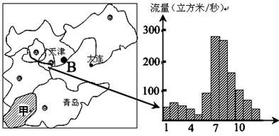 (1)简述图示河流最小流量出现的季节(1分)及其原因(3分)。