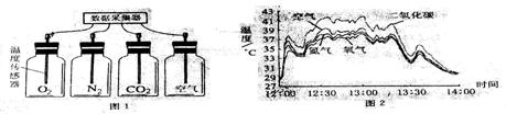 ⑷将制得的N2、O2、CO2及空气4瓶气体放在室外的太阳光下,在互相不遮太阳光的条件下尽量使集气瓶靠近,以保证地表和光照条件 。将温度传感器插入4个集气瓶中,连接好装置(如图1所示)。打开数据采集器,实验时间从北京时间12:00到14:00,测得此期间4瓶气体的温度由高到低的顺序是: 。