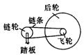 如图所示,某型号的自行车,其链轮(俗称牙盘与脚蹬相连)的齿数为44齿,飞轮(与后轮相连)的齿数为20齿,当链轮转动一周时,飞轮带动后轮转动n周;车轮的周长为2.0m,若骑车人以每分钟60圈的转速蹬链轮,自行车的行驶速度为v,则( A )