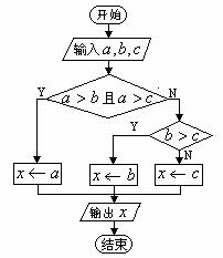 点评:条件结构可含有多个判断框,判断框内的内容要简明、准确、清晰.此题也可将第一个判断框中的两个条件分别用两个判断框表示,两两比较也很清晰.若改为求100个数中的最大数或最小数的问题则选择此法较繁琐,可采用假设第一数最大(最小)将第一个数与后面的数依依比较,若后面的数较大(较小),则进行交换,最终第一个数即为最大(最小)值.