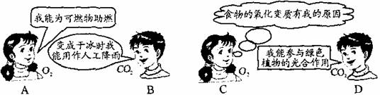 思路方法点拨:本题以卡通图画情景显示内容,考查物质的性质与物质的用途,属于历年中招考试中的常见题型。解答本题,首先要分析这四种物质的用途分别体现了物质的哪些性质。很明显,A选项“我能为可燃物助燃”即支持燃烧,这是氧气在化学变化中体现出来的物质的性质(氧化性);C食物的氧化变质属于化学变化----缓慢氧化,也体现氧气的氧化性;D光合作用也发生的是化学变化,体现CO2的化学性质;B干冰用于人工降雨,是因为干冰升华吸热,降低周围空气的温度使水蒸气凝结在一起而降雨,所以,B符合题意。