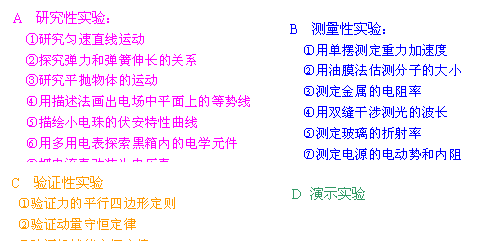 113.长度的测量 114.研究匀速直线运动 115.探究弹力和弹簧伸长的关系 116.验证力的平行四边形定则 117.验收动量守恒定律 118.研究平抛物体的运动 119.验证机械能守恒定律 120.用单摆测定重力加速度 121.用油膜法估测分子的大小 122.用描述法画出电场中平面上的等势线 123.测定金属的电阻率(同时练习使用螺旋测微器) 124.描绘小电珠的伏安特性曲线 125.把电流表改装为电压表 126.测定电源的电动势和内阻 127.用多用电表探索黑箱内的电学元件 128.练习使用示波器 129.传感器的简单应用 130.测定玻璃的折射率 131.用双缝干涉测光的波长 |