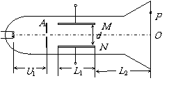 如图所示为一真空示波管,电子从灯丝K发出(初速度不计),经灯丝与A板间的加速电压U1加速,从A板中心孔沿中心线KO射出,然后进入两块平行金属板M、N形成的偏转电场中(偏转电场可视为匀强电场),电子进入M、N间电场时的速度与电场方向垂直,电子经过电场后打在荧光屏上的P点。已知加速电压为U1,M、N两板间的电压为U2,两板间的距离为d,板长为L1,板右端到荧光屏的距离为L2,电子的质量为m,电荷量为e。求: