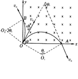 ,圆心位于过O与v0垂直的同一条直线上,O1O=O2O=O1A=O2B=R。带电粒子沿半径为R的圆周运动一周所花时间