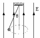 例8、在空间同时存在匀强磁场和匀强电场,匀强电场方向竖直向上,场强大小为E,匀强磁场方向和大小均未知,如图所示。现有一质量为m的带电小球,用长为L的绝缘线悬挂在一点,小球在水平面上以角速度ω作匀速圆周运动,顺着电场线方向观察,角速度为顺时针旋转,这时线与竖直方向夹角为θ,线上拉力为零。