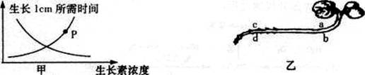 将植物横放,测量根和茎生长素浓度与其生长状况的关系如甲图所示。则曲线上P点最可能对应于乙图中的位置是: