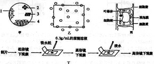 ③图丙是在高倍显微镜下观察到的黑藻叶细胞的细胞质处于不断流动的状态,图中所标记的那一个叶绿体实际流动所处的位置是位于右下角,逆时针方向流动。