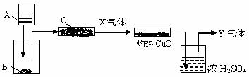 图中A是液体,B、C是固体。A与B反应后产生的气体经过C,得到纯气体X。X通过灼热CuO,CuO转化为Cu。气体再通过浓H2SO4,最后得到纯气体Y,Y是对环境没有污染的气体,大量排放也没有危险。