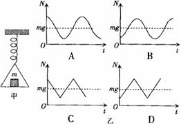 2. (08届全国100所名校单元测试示范卷·高三)如图甲所示,在弹性限度内,将盘下拉至某处后释放,盘中物体随盘一起做简谐振动,从放手开始计时,图乙中能正确反映物体对盘的压力随时间变化关系的是(   )