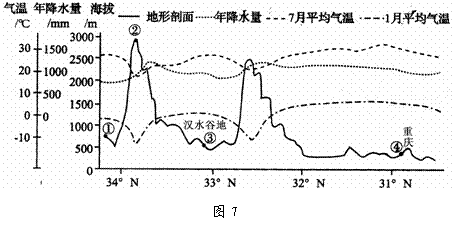 图7是沿106.5°E的地形剖面及相关气候资料图。据图判断下列说法正确的是