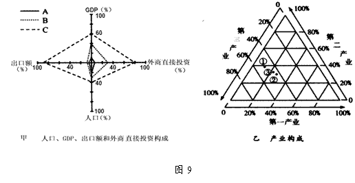 图9中甲乙两图是2005年我国三大经济地带的有关资料,其中