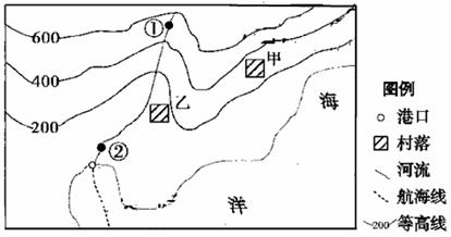 A.乙村人比甲村人先看到日出 B.②点比①点流水侵蚀作用强