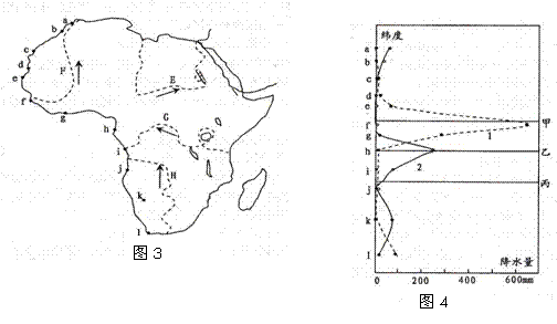图3中a-l表示非洲西海岸地带的城市。图4中折线1、2表示这些城市1月与7月的降水量分布,甲、乙和丙中的某一条直线表示赤道。据此回答10-11题。