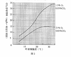 (3)在暗反应中,CO2必须与RuBP(五碳化合物)结合,这是CO2被固定的第一步,RuBP可循环使用,使光合作用不断进行,但O2也可与RuBP结合,生成三碳化合物和一个二氧化碳,此二碳化合物不参与光合作用,图2为不同O2浓度下叶表面温度与光合作用速率的关系。回答下列问题。