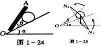 当挡板与斜面的夹角β由图示位置变化时.N1大小改变.但方向不变.始终与斜面垂直:N2的大小、方向均改变(图1一25中画出的一系列虚线表示变化的N2).由图可看出.当N2与N1垂直即β=900时,挡板AO所受压力最小,最小压力N2min=mgsinα.