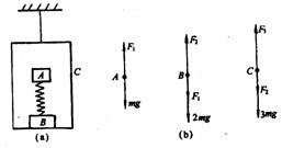 (2)当A、B体现为拉力,C体现为推力:平衡时:3F+F=mg,∴F=¼mg;剪断C时:3F-mg=ma2 , ∴a2=-¼g,方向竖直向下.故答案C.