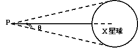 [例10]兴趣小组成员共同协作,完成了下面的两个实验:①当飞船停留在距X星球一定高度的P点时,正对着X星球发射一个激光脉冲,经时间t1后收到反射回来的信号,此时观察X星球的视角为θ,如图所示.②当飞船在X星球表面着陆后,把一个弹射器固定在星球表面上,竖直向上弹射一个小球,经测定小球从弹射到落回的时间为t2.