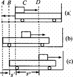 到共同速度v前的过程,可用图(a) (b) (c)表示.图(a)为平板车与墙碰撞后瞬间滑块与平板车的位置,图(b)为平板车到达最左端时两者的位置,图(c)为平板车与滑块再次达到共同速度时两者的位置.在此过程中滑块动能减少等于摩擦力对滑块所做功µmgs/,平板车动能减少等于摩擦力对平板车所做功µmgs//(平板车从B到A再回到B的过程中摩擦力做功为0),其中s'