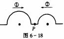 [例1]一个波源在绳的左端发出半个波①,频率为f1,振幅为A1;同时另一个波源在绳的右端发出半个波②,频率为f2,振幅为A2, P为两波源的中点,由图6-18可知,下述说法错误的是( )