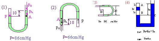 液面A和气体液面等高,故两液面的压强相等, 则中气体压强:p=pA= P0+h(cmHg).