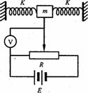 [例10]图为一种加速仪的示意图,质量为m的振子两端连有劲度系数均为K的轻弹簧,电源动势为E,不计内阻,滑动变阻器的总阻值为R,有效长度为L,系统静止时滑动触头位于滑动变阻器正中,这时电压表指针恰好在刻度盘正中。求: