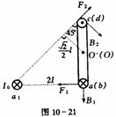 解析:ad、bc边所受的磁场力和转轴OO/平行,其力矩为零,ab、cd边受力的方向如图10-21所示,大小分别为F1=B1I·2L,F2= B2I·2L,F1、F2对转轴OO/的力臂分别为L和
