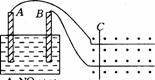 [例11]将两碳棒A,B(接电路)插盛有AgNO3溶液的容器中,构成如图电路.假设导轨光滑无电阻,宽为d,在垂直导轨平面方向上有大小为B,方向垂直纸面向外的磁场,若经过时间t后,在容器中收集到nL气体(标况),问此时滑杆C(质量为mC)的速度,写出A,B棒上发生的电极反应式(阿伏加德罗常数N0)