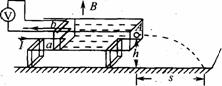 [例12]如图所示为利用电磁作用输送非导电液体装置的示意图,一边长为L、截面为正方形的塑料管道水平放置,其右端面上有一截面积为A的小喷口,喷口离地的高度为h.管道中有一绝缘活塞,在活塞的中部和上部分别嵌有两根金属棒a、b,其中棒b的两端与一电压表相连。整个装置放在竖直向上的匀强磁场中,当棒a中通有垂直纸面向里的恒定电流I时,活塞向右匀速推动液体从喷口水平射出,液体落地点离