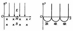 解析:由于此带电粒子是从静止开始释放的,要能经过M点,其起始位置只能在匀强电场区域.物理过程是:静止电荷位于匀强电场区域的y轴上,受电场力作用而加速,以速度V进入磁场,在磁场中受洛仑兹力作用作匀速圆周运动,向X轴偏转.回转半周期过X轴重新进入电场,在电场中经减速、加速后仍以原速率从距O点2R处再次超过X轴,在磁场回转半周后又从距O点4R处飞越X轴如图10一53所示(图中电场与磁场均未画出)故有L=2R,L=2×2R,L=3×2R