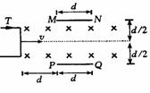 [例3]初速为零的离子经过电势差为U的电场加速后,从离子枪T中水平射出,经过一段路程后进入水平放置的两平行金属板MN和PQ之间.离子所经空间存在一磁感强度为B的匀强磁场,如图所示.(不考虑重力作用),离子荷质比q/m(q、m分别是离子的电量与质量)在什么范围内,离子才能打在金属板上?