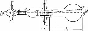 [例9]汤姆生用来测定电子的比荷(电子的电荷量与质量之比)的实验装置如图所示,真空管内加速后,穿过A'中心的小孔沿中心轴010的方向进入到两块水平正对放置的平行极板P和P/,间的区域.当极板间不加偏转电压时,电子束打在荧光屏的中心0点处,形成了一个亮点;加上偏转电压U后,亮点偏离到0'点,(O'与0点的竖直间距为d,水平间距可忽略不计).此时,在P和P/间的区域,再加上一个方向垂直于纸面向里的匀强磁场.调节磁场的强弱,当磁感应强度的大小为B时,亮点重新回到0点.已知极板水平方向的长度为L1,极板间距为b,极板右端到荧光屏的距离为L2(如图所示).