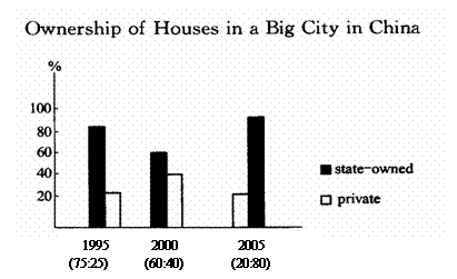 As can be seen from the chart, ownership of houses in a big city in China changed in the past ten years. In 1995, 75 percent of the houses were state-owned. Five years later, the rate of state-owned houses to private ones was 3 to 2. But from then on, the ownership of houses changed rapidly and so far 80 percent of houses have been private.