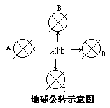 [练习] 在下图中画出A、B、C、D四个位置地球的晨昏线、用斜线表示夜半球,注明日期和节气,标出自转和公转方向。