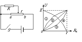 例4:左图为分压器接法电路图,电源电动势为E,内阻不计,变阻器总电阻为r。闭合电键S后,负载电阻R两端的电压U随变阻器本身a、b两点间的阻值Rx变化的图线应最接近于右图中的哪条实线?