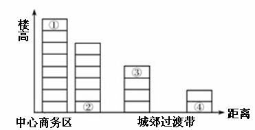 读图可知,①②位于城市功能分区的商业区,③位于住宅区,④位于工业区。据商业区中功能的垂直分异规律,①位于商业区的高层,应为办公室,②位于商业区的底层应为零售店,③、④在垂直方向上分异不明显,分别为住宅和厂房。