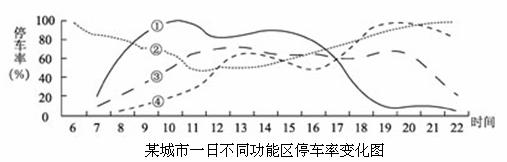 [解析]住宅是人们主要休息场所,晚间多休息,故停车率较高。白天多工作,故停车率较低。从停车率变化图中看曲线②符合。商业区昼夜人口变化率大,白天人多,停车率高,半夜人口稀少,甚至空无一人,停车率低,故曲线③符合题意。